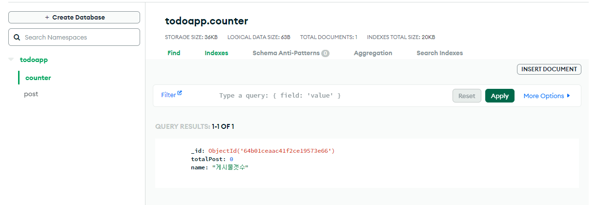 // 4. counter란 collection에 이름이 게시물갯수인 것을 찾아서 totalPost란 항목을 1 증가시킴